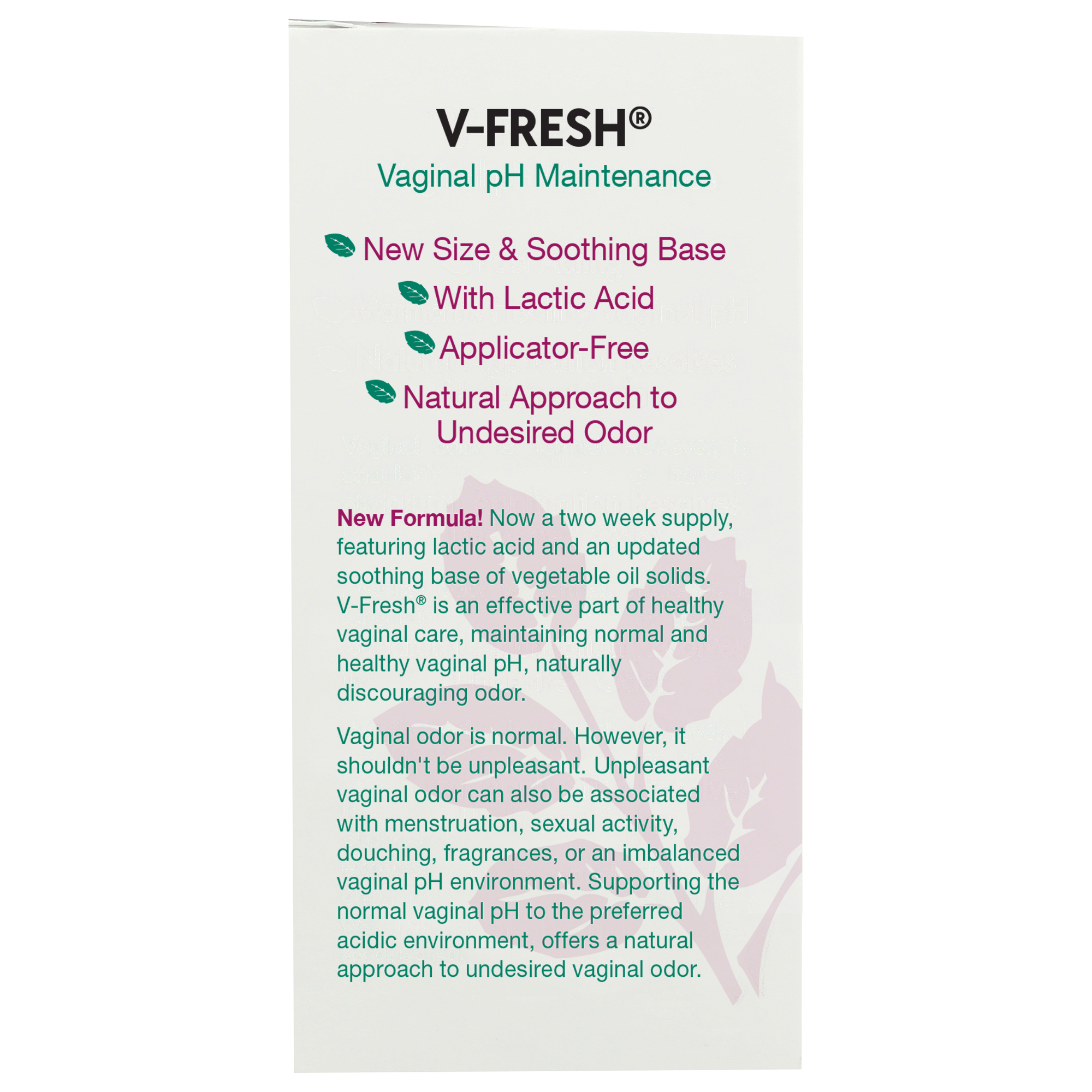 Indications: Supports a healthy vaginal pH, naturally resolves undesired vaginal odor, with an updated, easy-to-use lactic acid suppository.