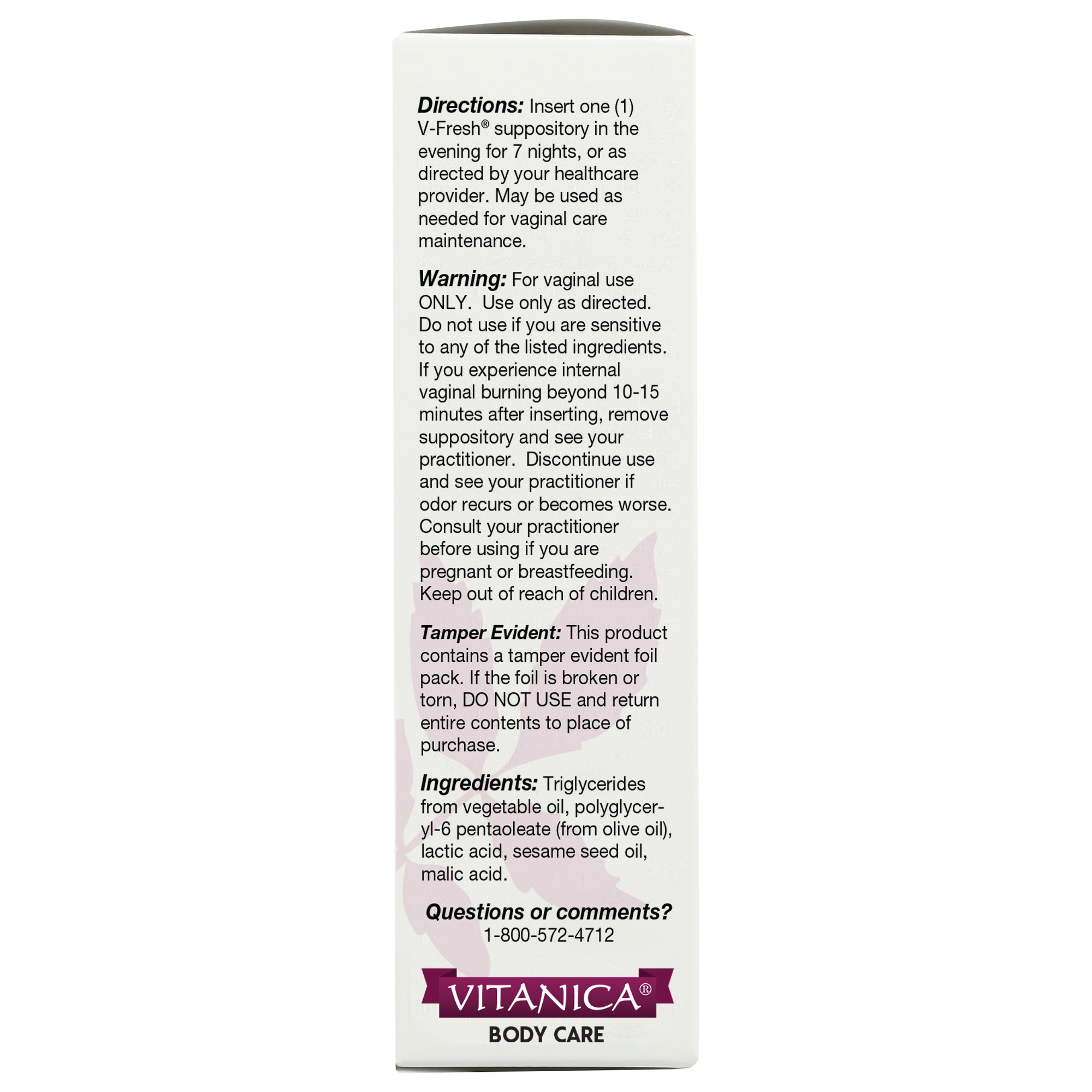 For Vaginal use ONLY. Use only as directed. Do not use if you are hypersensitive to any of the listed ingredients. If you experience internal vaginal burning beyond 10-15 minutes after inserting, remove suppository and see your practitioner. Discontinue use and see your practitioner if odor recurs or becomes worse. Consult your practitioner before using if you are pregnant or breastfeeding. Keep out of reach of children.